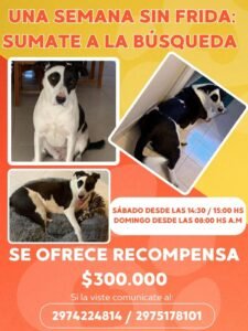 Frida es una perra esterilizada, con un collar de identificación y un pretal con correa. Su característica más distintiva es su cola negra con la punta blanca. La familia ofrece una recompensa de $300.000 para quien pueda ayudar a localizarla.