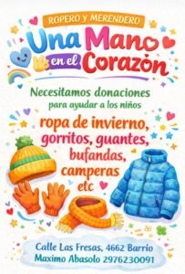 Con la llegada de las bajas temperaturas, el ropero y merendero “Una Mano en el Corazón” ha lanzado una convocatoria urgente a la comunidad para recolectar donaciones de ropa de abrigo destinadas a los niños que asisten a la institución. La organización busca asegurar que ningún pequeño pase frío durante la temporada invernal.