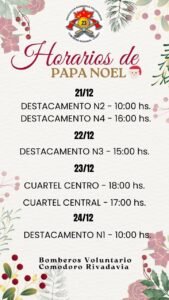 Los Bomberos Voluntarios de Comodoro Rivadavia dieron a conocer el cronograma de salidas de Papá Noel, quienes recorrerán distintos barrios de la ciudad repartiendo golosinas y alegría para los más chicos.