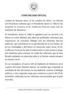 Desde la Oficina del Presidente, confirmaron que se aceptó la dimisión a la jefatura de Gabinete de Francos. En un apartado se destacó: “El Presidente Javier G. Milei le agradece por su servicio a la Patria en estos últimos dos años de profundas reformas que requirieron un continuo diálogo con las distintas fuerzas políticas, que resultaron en la aprobación de la Ley Bases, de la Ley Antimafias y del Juicio en Ausencia, entre otras. El Dr. Guillermo Francos ha sido fundamental en esta primera etapa del Gobierno para avanzar en todas las reformas que se han llevado adelante en estos dos años y la Nación estará siempre en deuda con él.