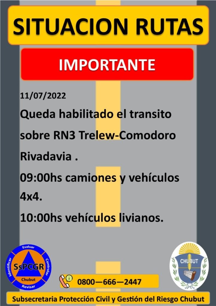 Tras permanecer cerrada desde las 19 del domingo para todo tipo de vehiculo, este lunes Vialidad Nacional informo que a partir de las 09hs se rehabilitó la circulación en la Ruta Nacional Nro. 3, entre Trelew-Comodoro Rivadavia.