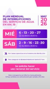 Informamos a los asociados de Km. 18 que, durante el mes de mayo de 2026, se llevarán adelante cortes programados del servicio de agua potable, los miércoles 06, 13, 20 y 27 y también los sábados 02, 09, 16, 23 y 30, en el horario de 08:00 a 16:00hs.