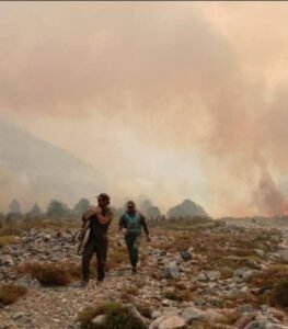 La imagen destaca a Luciano Cornelio, policía comunitario de Cholila, caminando entre humo, piedras y cansancio, pero también rodeado de gestos de humanidad y compromiso. Según relata la publicación, Luciano es uno de los tantos efectivos que en estos días dejó de lado el descanso, el hogar y la familia para estar donde hacía falta, peleando contra el fuego junto a los vecinos.