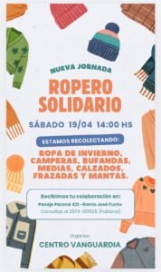 Este sábado 19 de abril a las 14:00 horas, el Centro Vanguardia llevará adelante una nueva edición del Ropero Solidario, una iniciativa solidaria que busca brindar abrigo a quienes más lo necesitan en este invierno que comienza a sentirse.