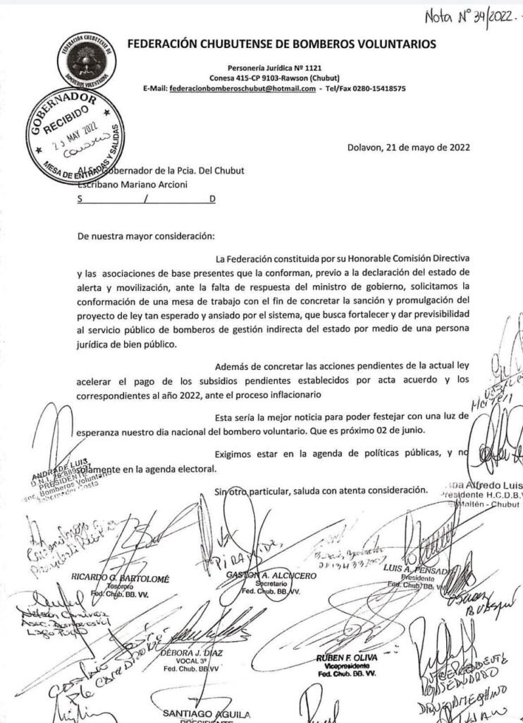 “La Federación constituida por su Honorable Comisión Directiva y las asociaciones de base presentes que la conforman, previo a la declaración del estado de alerta y movilización, ante la falta de respuesta del ministro de gobierno, solicitamos la conformación de una mesa de trabajo con el fin de concretar la sanción y promulgación del proyecto de ley tan esperado y ansiado por el sistema que busca fortalecer y dar previsibilidad al servicio público de bomberos de gestión indirecta del Estado por medio de una persona jurídica de bien público”, inicia la nota remitida al gobernador y firmada por todas las asociaciones que pudieron estar presentes en la reunión, que fueron más del 70% de las que integran el Sistema Provincial de Bomberos.