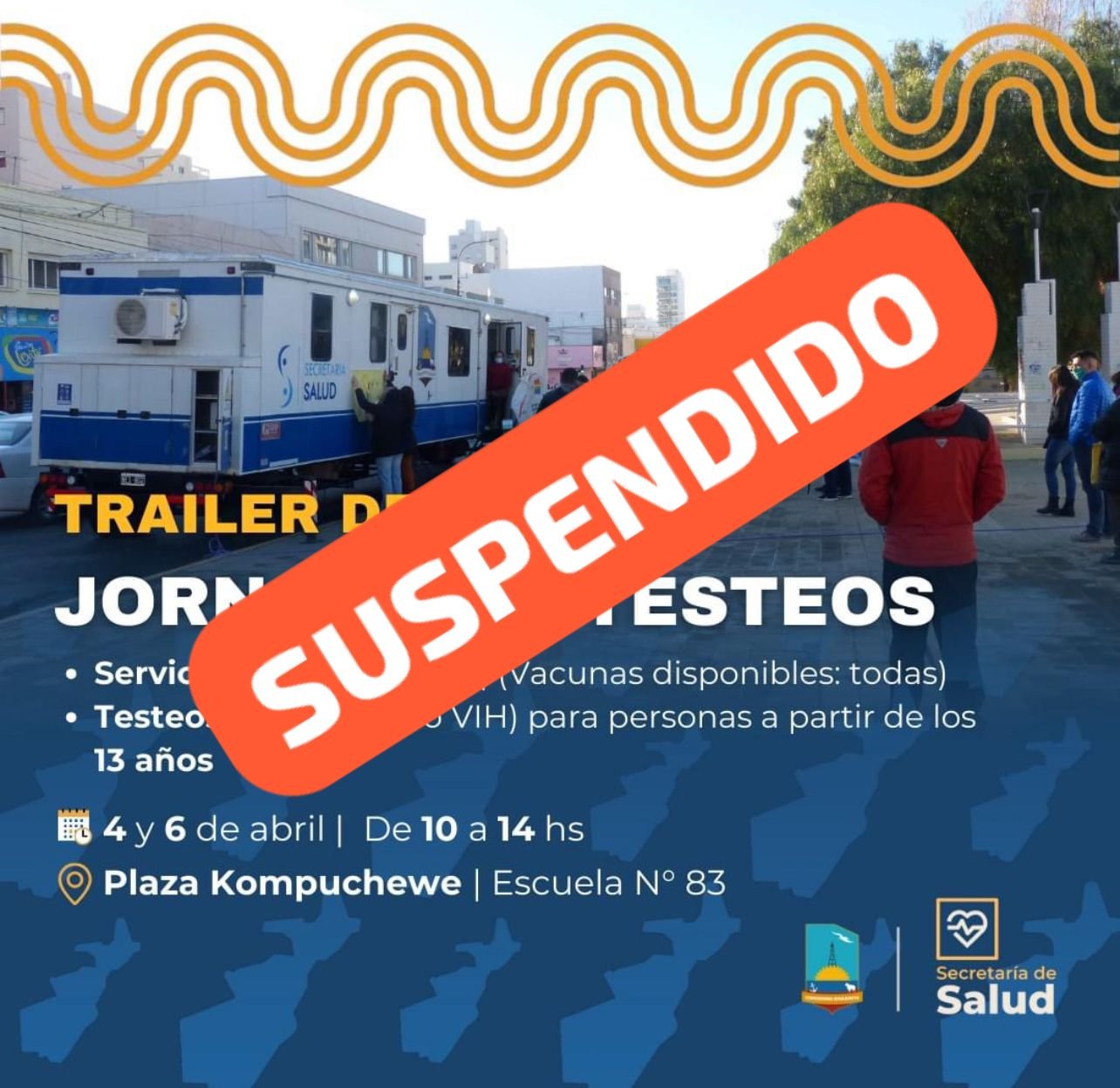 La Municipalidad de Comodoro Rivadavia informa que, a raíz de los fuertes vientos que se registran en la ciudad, se suspenden las actividades de salud previstas para este sábado: testeos en el tráiler de salud, promoción de la salud en el CAPS Pte. Ortiz, y actividad física en la vecinal de barrio Stella Maris.