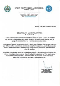 El sindicato exigió el pago inmediato de los sueldos adeudados y la recomposición urgente del salario para recuperar el poder adquisitivo perdido. “La UTA reafirma su compromiso de acompañar y respaldar todas las acciones necesarias para garantizar condiciones laborales y salariales dignas”, afirmó el secretario general Roberto Carlos Fernández en el cierre del documento.