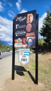 El cartel identificatorio puede encontrarse sobre ruta Nacional 40 a metros del cruce a Cerro Radal (bajada a Lago Puelo). Es un hermoso cartel muy fotogénico e “instagrameable” que además invitará al turista a probar las diferentes marcas de Alfajores que se ofrecen en Lago Puelo y la Comarca Andina.