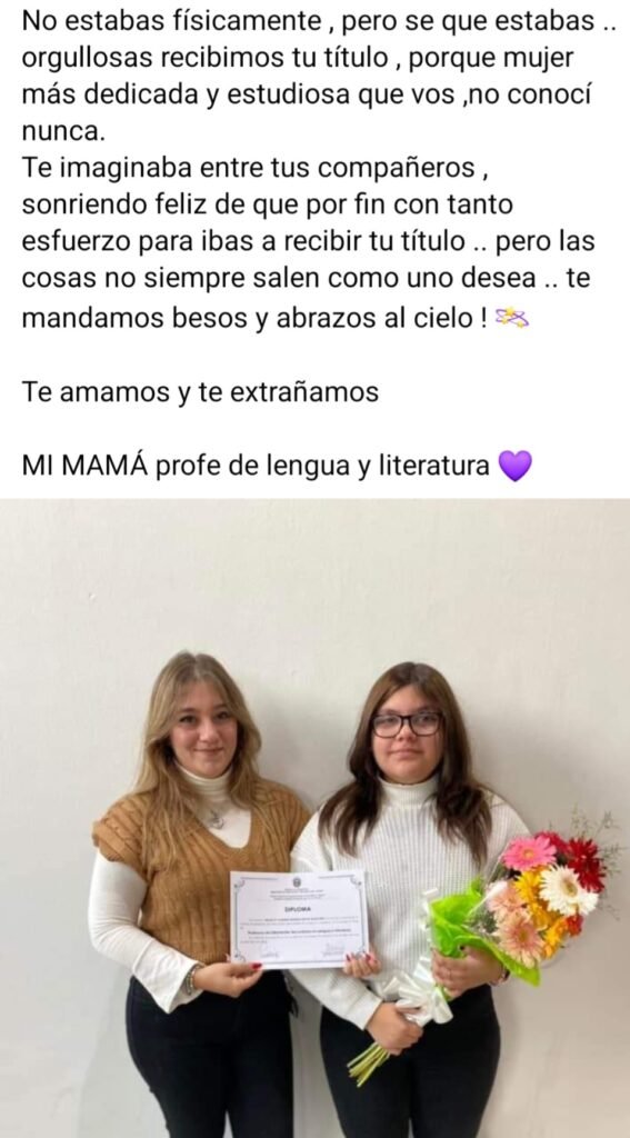 Desde redes sociales, la hija de Daniela dedico unas sentidas palabras “No estabas físicamente , pero se que estabas, orgullosas recibimos tu título , porque mujer más dedicada y estudiosa que vos ,no conocí nunca.Te imaginaba entre tus compañeros , sonriendo feliz de que por fin con tanto esfuerzo para ibas a recibir tu título .. pero las cosas no siempre salen como uno desea .. te mandamos besos y abrazos al cielo!”, expresó Melanie.