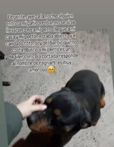 A través de las redes sociales, Micaela indicó que «ayer le entraron a robar a mi sobrino en el barrio Quirno Costa, tenemos un perro Rottweiler macho con la cola corta y no está».