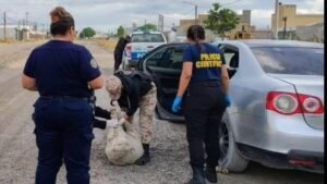 Del rodado descendieron dos hombres adultos y un menor de edad. Al inspeccionar el baúl, los policías hallaron un perro de raza galgo, de color blanco y negro. Ante la situación, se procedió al secuestro del vehículo, dos ovejas, un cordero y el can.