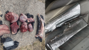 Luego, la camioneta fue interceptada y al hacer descender a sus ocupantes observaron que en la caja llevaban una bolsa de nylon y una conservadora con carne de guanaco despostada. A su vez, otro de ellos tenía una bolsa con un cordero faenado.
