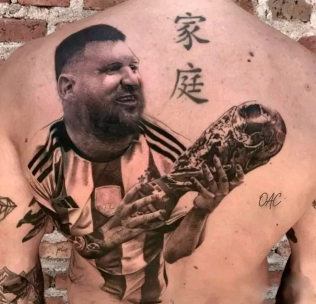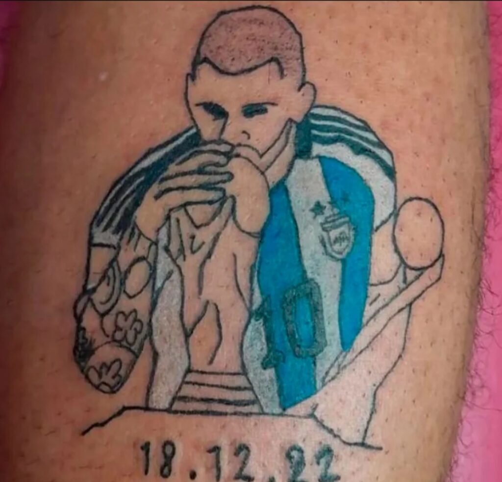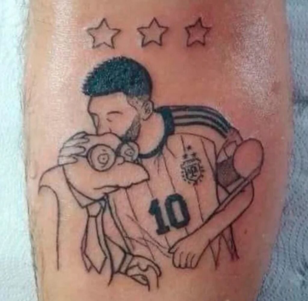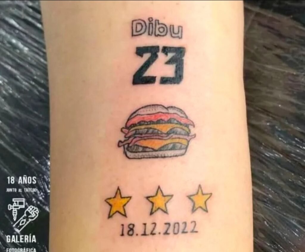 Uno de los más extraños fue un tatuaje de la hamburguesa triple que promociona el arquero argentino con la fecha de la final ganada ante Francia y las tres estrellas. Aunque el que más sorprendió fue el que se realizó un hombre que se escribió con tinta un “Messi” gigante en la frente junto a las tres estrellas y la palabra D10S en sus cachetes.
