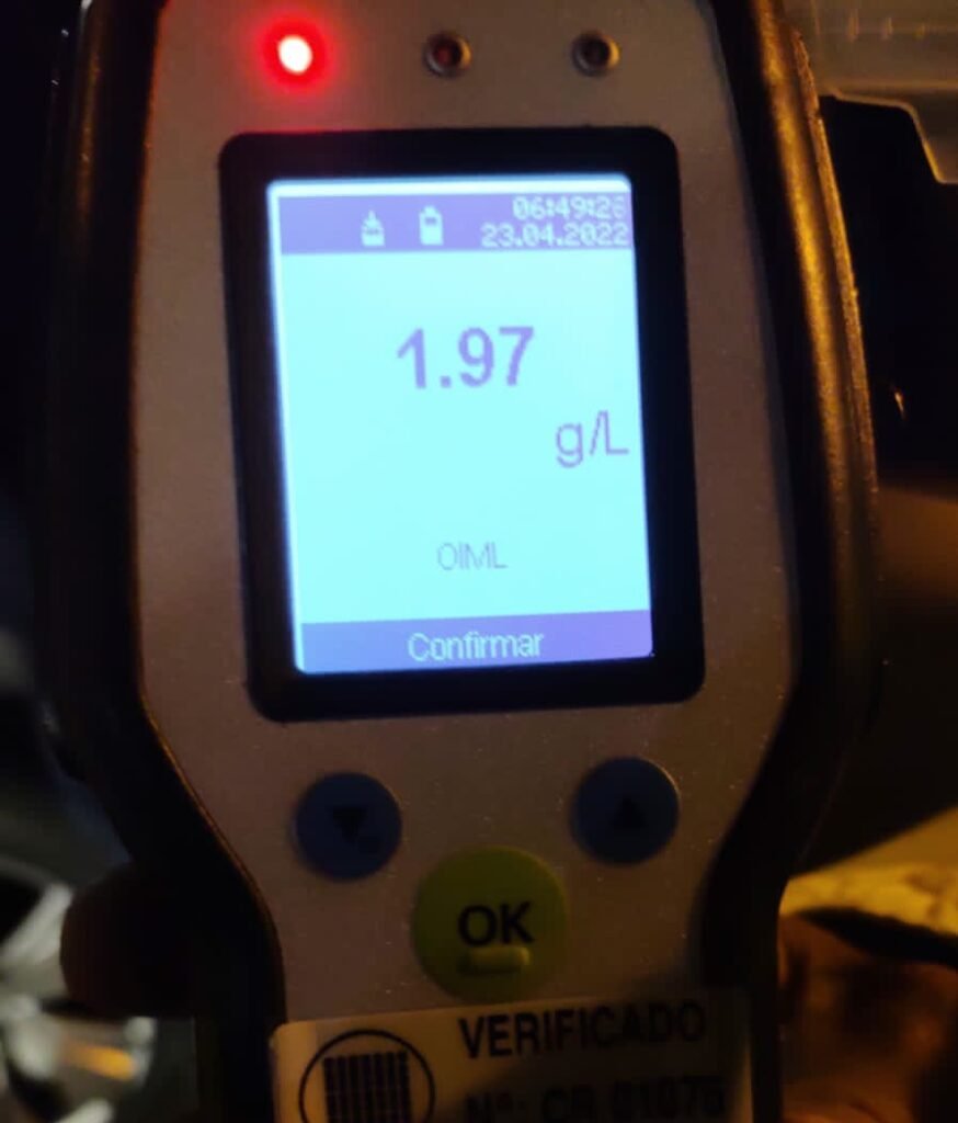 Tras observar la situación uniformados llamaron a Tránsito para realizar test de alcoholemia. Dando positivo y arrojando 1.97/gl de alcohol en sangre.
