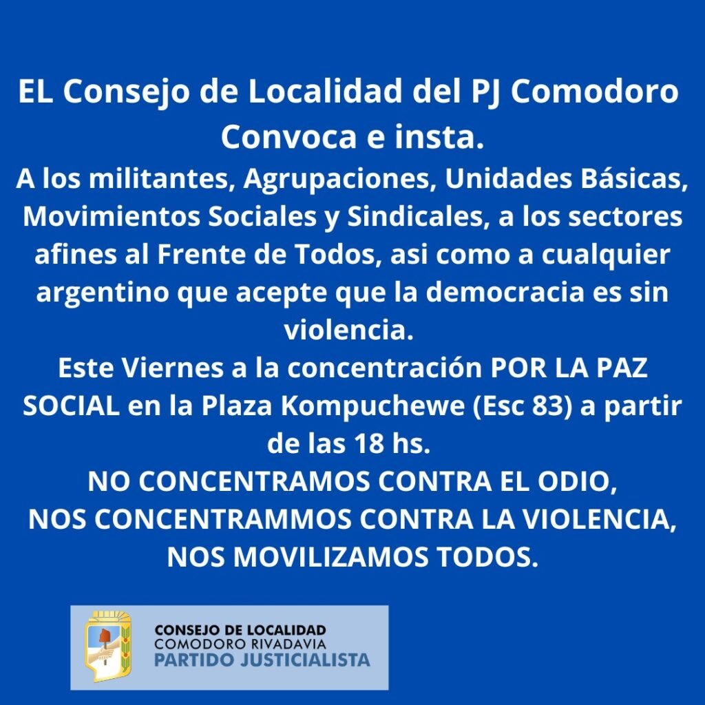 A través de un comunicado el Consejo de localidad del PJ, convoca e insta a los militantes, agrupaciones, unidades básicas, movimientos sociales y sindicales a los sectores afines al Frente de Todos, así como a cualquier argentino que acepte que la democracia es sin violencia. Este viernes a la concentración por la paz social en la plaza de la Escuela 83 a partir de las 18 horas.