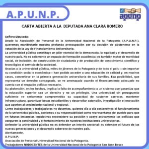 A través de dos cartas abiertas, la Asociación de Personal No Docente (A.P.U.N.P.) expresó su preocupación por la postura de las diputadas, entre ellas Ana Clara Romero, quien se abstuvo en la votación.