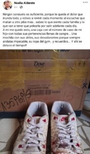 A mi me quedó esto, una caja con el número de caso de mi hijo con todas sus pertenencias llenas de sangre… Una mochila con sus útiles, sus desodorantes porque siempre andaba impecable, su ropa del gym.. y recuerdos… Y ahí se detuvo el tiempo”.