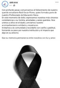 “Con profundo pesar, comunicamos el fallecimiento de nuestro querido estudiante Raúl Oscar Flores, quien formaba parte de nuestro Profesorado de Educación física .