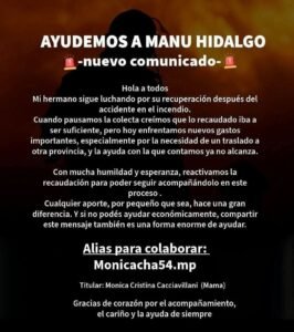 Ahora, la familia del brigadista difundió un nuevo pedido para reactivar la colecta solidaria y afrontar los gastos que demanda su recuperación. Si bien en un primer momento se consideró que lo recaudado era suficiente, surgieron nuevos costos, principalmente por la necesidad de un traslado a otra provincia.