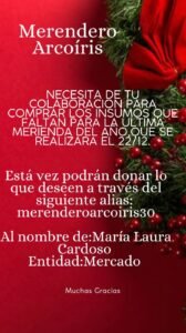 Quienes deseen colaborar pueden hacerlo mediante aportes económicos, donando el monto que esté a su alcance a través del alias: merenderoarcoiris30 a nombre de María Laura Cardoso, entidad Mercado Pago.