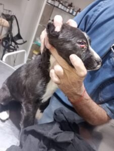 El perro, fue abandonado y necesita una operación urgente en su ojo ya que lo tienem muy comprometido. La misma, tiene un valor de 190 mil pesos, a su vez necesita una familia que lo adopte y alimento.