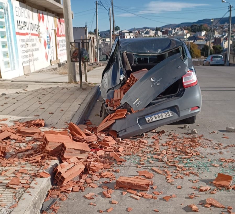 Esto último se produjo alrededor de las 13:40 horas, sobre Maipu al 1798, cuando producto de las fuertes ráfagas se comenzó a desprender una parte de la pared de material (cemento y ladrillos), impactando sobre un Renault Logan, ocasionando daños en el vehículo.