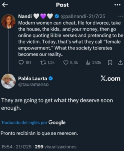 Entre los posteos recuperados, sobresale una frase que ahora resuena con fuerza. “Pronto recibirán lo que se merecen”, escribió Laurta en respuesta a una crítica al movimiento feminista.