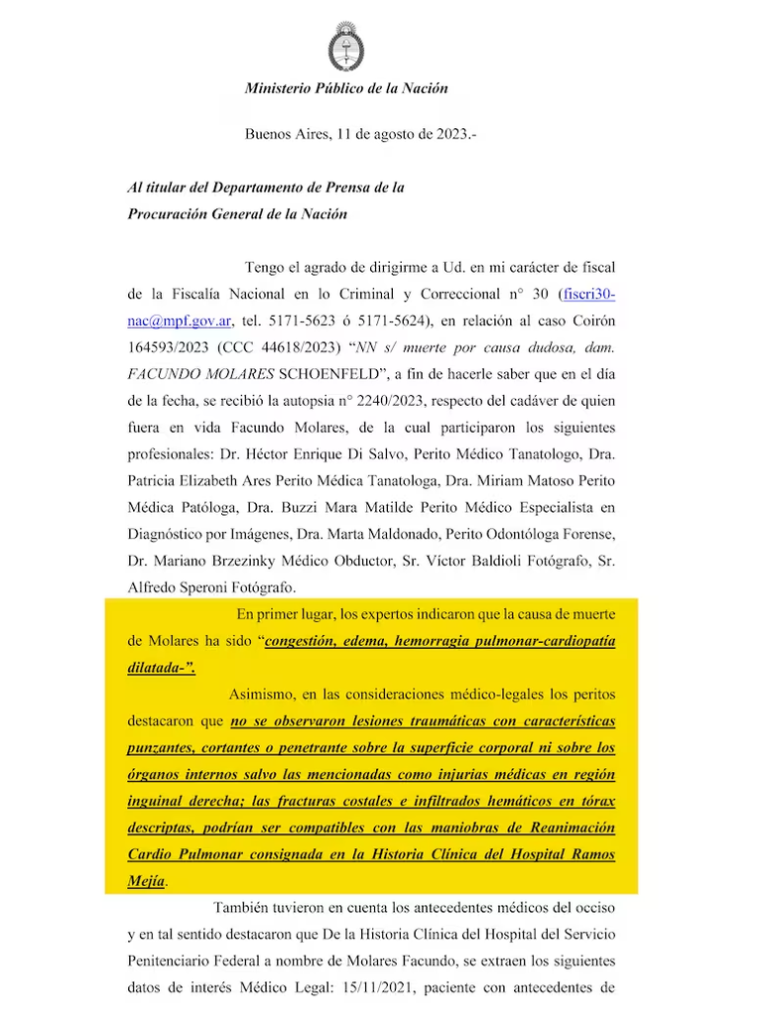 El Ministerio Público Fiscal de la Nación dio a conocer este viernes por la tarde el resultado de la autopsia al cuerpo de Facundo Molares Schoenfeld, el hombre de 47 años que murió este jueves luego de un enfrentamiento con efectivos de la Policía de la Ciudad