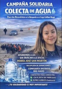 En el marco del intenso operativo de búsqueda de María José San Martín en el Lago Colhué Huapi, se puso en marcha una campaña solidaria para acompañar y asistir a los rescatistas que trabajan en el lugar. La iniciativa tiene como objetivo recolectar agua potable para el personal que participa de las tareas, muchas de ellas realizadas en condiciones climáticas y físicas exigentes.