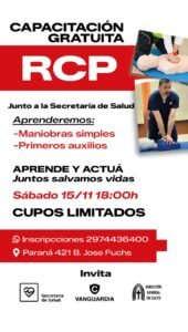 Con el acompañamiento de la Secretaría de Salud, la Dirección General de Culto y la organización Vanguardia, se llevará adelante una capacitación gratuita en RCP y primeros auxilios, destinada a toda la comunidad.