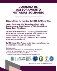El próximo sábado 8 de noviembre, de 10 a 13 horas, se llevará a cabo una jornada de asesoramiento notarial solidario en el Centro de Día del barrio Don Bosco, ubicado en Buenaventura Rosa Martins 483. La propuesta está destinada a personas mayores, sus entornos familiares y al público en general, y contará con la participación de escribanos de la ciudad que ofrecerán atención gratuita y personalizada.
