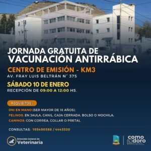 La Municipalidad de Comodoro Rivadavia, a través de la Dirección General de Veterinaria, llevará adelante una jornada gratuita de vacunación antirrábica destinada a perros y gatos.