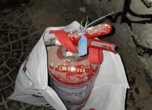 Personal policial realizaba patrullaje preventivo cuando vio al sujeto con actitud sospechosa. Al identificarlo constataron que llevaba un matafuego con la inscripción “Carrefour”.