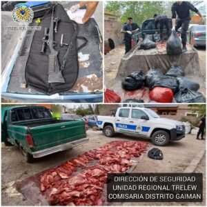 El procedimiento fue realizado por personal de la Comisaría de Gaiman, que interceptó una camioneta Ford F100 cargada con bolsas que contenían carne de unos 26 animales faenados. También se secuestró un arma de fuego.