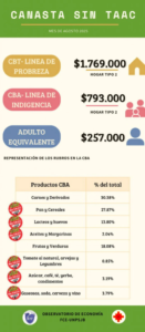 En términos económicos, la línea de pobreza (CBT) se ubicó en $1.769.000, mientras que la línea de indigencia (CBA) alcanzó los $793.000. Para un adulto equivalente, el costo de los productos sin TACC se calculó en $257.000.