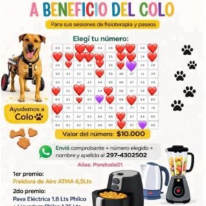 La iniciativa fue difundida por Laila Soto, quien explicó que el animal puede caminar, pero requiere paseos asistidos en carrito y sesiones de fisioterapia para seguir evolucionando. En ese marco, se organizó una rifa solidaria con el objetivo de reunir fondos.