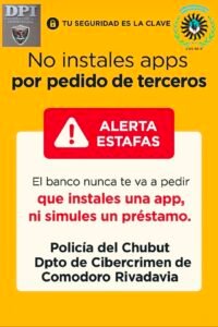 La División Policial de Investigaciones y el Departamento de Cibercrimen de Comodoro Rivadavia alertan que los bancos nunca solicitan descargar apps ni simular préstamos, y recomiendan cortar el contacto ante cualquier pedido de ese tipo.