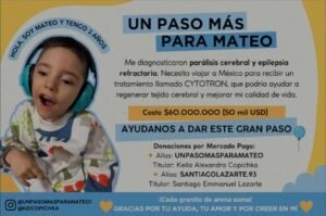 Keila Copichka lleva tres meses con un único objetivo en su cabeza: reunir los 50 mil dólares que necesita para pagar los costos del tratamiento que le cambiaría la vida a Mateo, su hijo de tres años y medio que padece una discapacidad derivada de su nacimiento prematuro. Para hacerlo, tiene que viajar a México y tiene una fecha límite para el pago: el 9 de octubre.