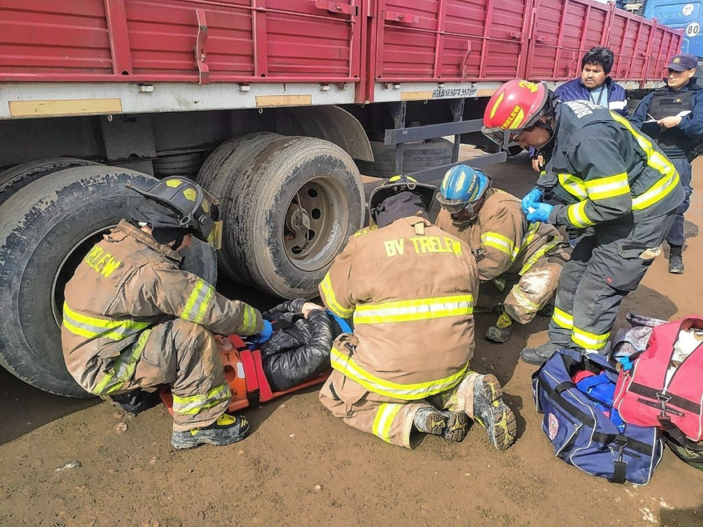 Un motociclista embistió contra el acoplado de un camión, pero al rebotar contra las duales se salvó por muy poco de que estas lo pasaran por encima. El joven resulto con una fractura en uno de sus tobillos. El accidente aconteció ayer por la tarde en el ingreso de una estación de servicio en el acceso norte de Trelew.
