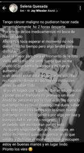 “Tengo cáncer maligno, no pudieron hacer nada lamentablemente. Hace dos horas desperté por efecto de los medicamentos y mi boca se hizo a un lado. Ahora nos toca esperar el momento, no nos dieron mucho tiempo, pero algo tendré que disfrutar. Puse la mejor cara para el momento de la foto, al verla al lado mío me sentí fuerte y se me olvidó lo que sentía. La abracé y mi fuerza aumentó”, decía parte del texto.
