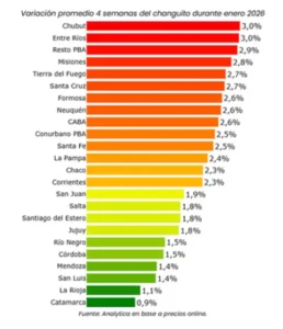 Chubut, Entre Ríos y el interior de la provincia de Buenos Aires fueron las regiones donde la variación mensual del carrito de supermercado fue mayor. Registraron un alza de 3% y 2,9%, respectivamente durante el mes pasado. Por el contrario, Catamarca tuvo subas por debajo de 1%.