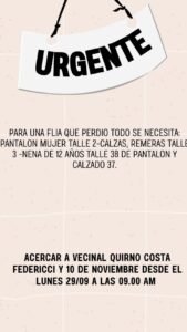Quienes quieran colaborar pueden hacerlo con ropa, calzado, alimentos y artículos de primera necesidad y acercarlos a la Vecinal del barrio Quirno Costa ubicada en Federicci y 10 de Noviembre. “Son únicamente ellas dos, por lo que cualquier aporte es valioso en este momento tan duro”, expresaron allegados.