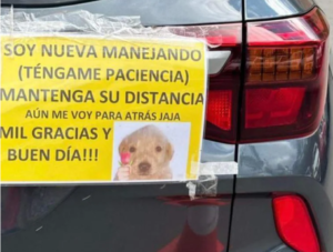 En la imagen compartida en la plataforma, se puede apreciar un cartel amarillo colocado en la parte trasera del vehículo, con el siguiente mensaje conciso y simpático: “Soy nueva manejando (téngame paciencia). Mantenga su distancia, aún me voy para atrás jaja”. Además, la conductora añadió una nota de agradecimiento con un toque de humor, que decía: “Mil gracias y buen día”, acompañada de la imagen de un meme de un perrito sosteniendo una rosa.
