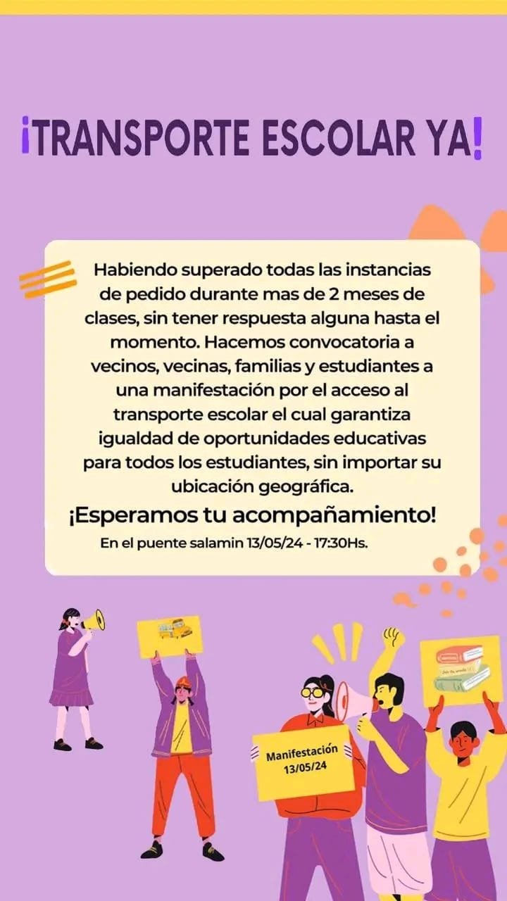 «Vecinos, vecinas, estudiantes y familias convocamos a la manifestación el día lunes 13/05 en el horario 17:30 hs en el puente Salamin”, indicaron.