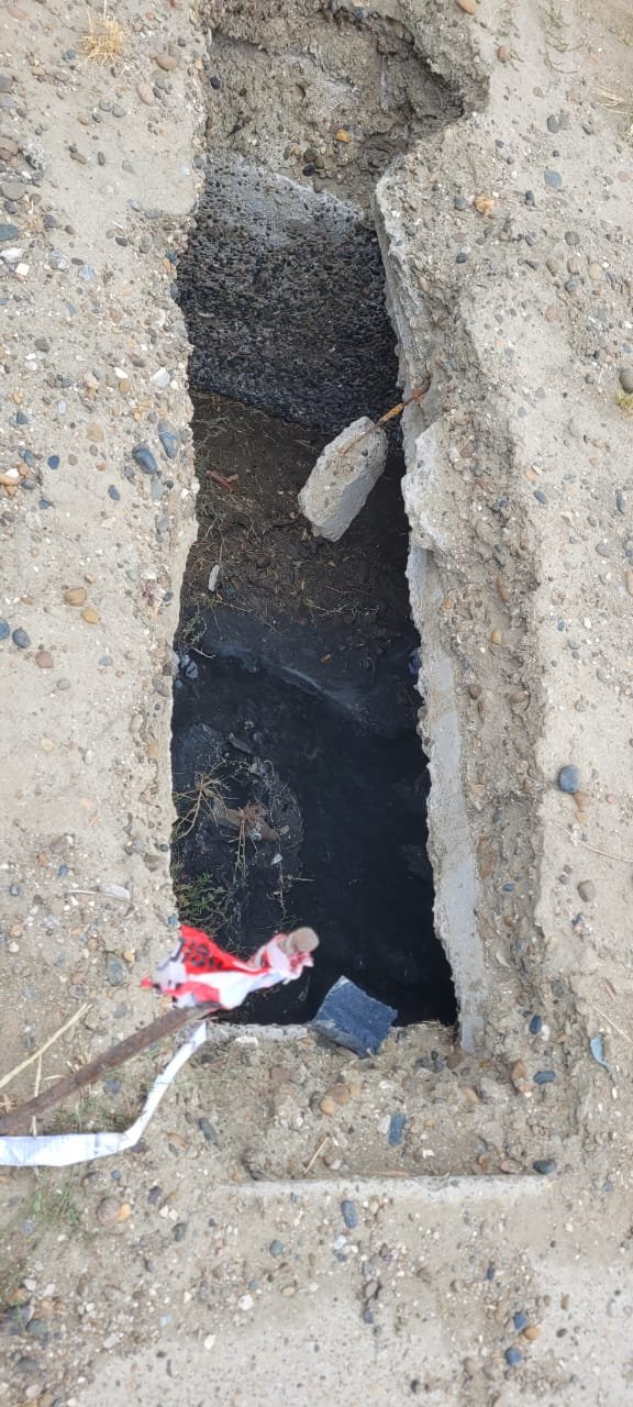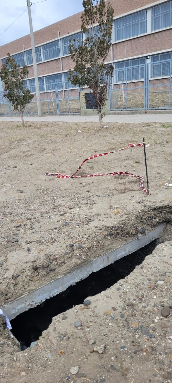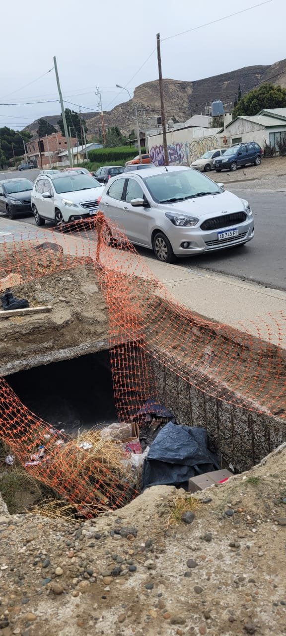 “Quedaron dos pozos del desagüe de la calle y tienen una profundidad de 1,50 metros masomenos. No están marcados, no hay iluminación y es muy peligroso porque están en la puerta de la Escuela Hipólito Yrigoyen”, expresó Soledad Cárcamo.