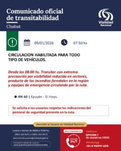 De acuerdo al comunicado oficial emitido este jueves 9 de enero a las 7:50 horas, desde las 08:00 se permite el tránsito, aunque se solicita extrema precaución debido a la visibilidad reducida en algunos sectores, como consecuencia del humo generado por los incendios forestales que afectan a la región.